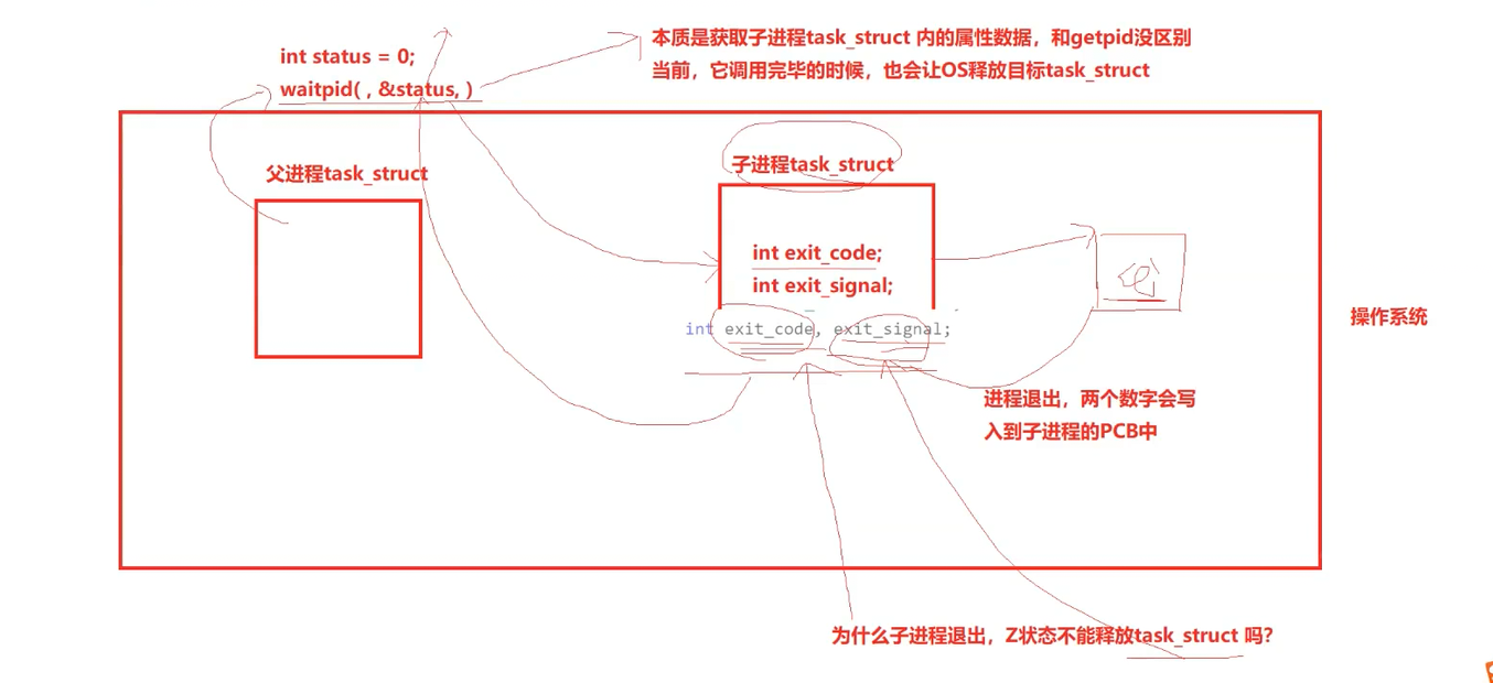 我们回顾一下前面说的僵尸状态,就是我们的父进程创建子进程,子进程结束了,它的代码和数据都被释放了,但是它的结构体这个节点还存在,此时如果父进程不管他,此时它就处于僵尸状态,所以说我们要是想解决这个问题,进程等待就是必须的了。