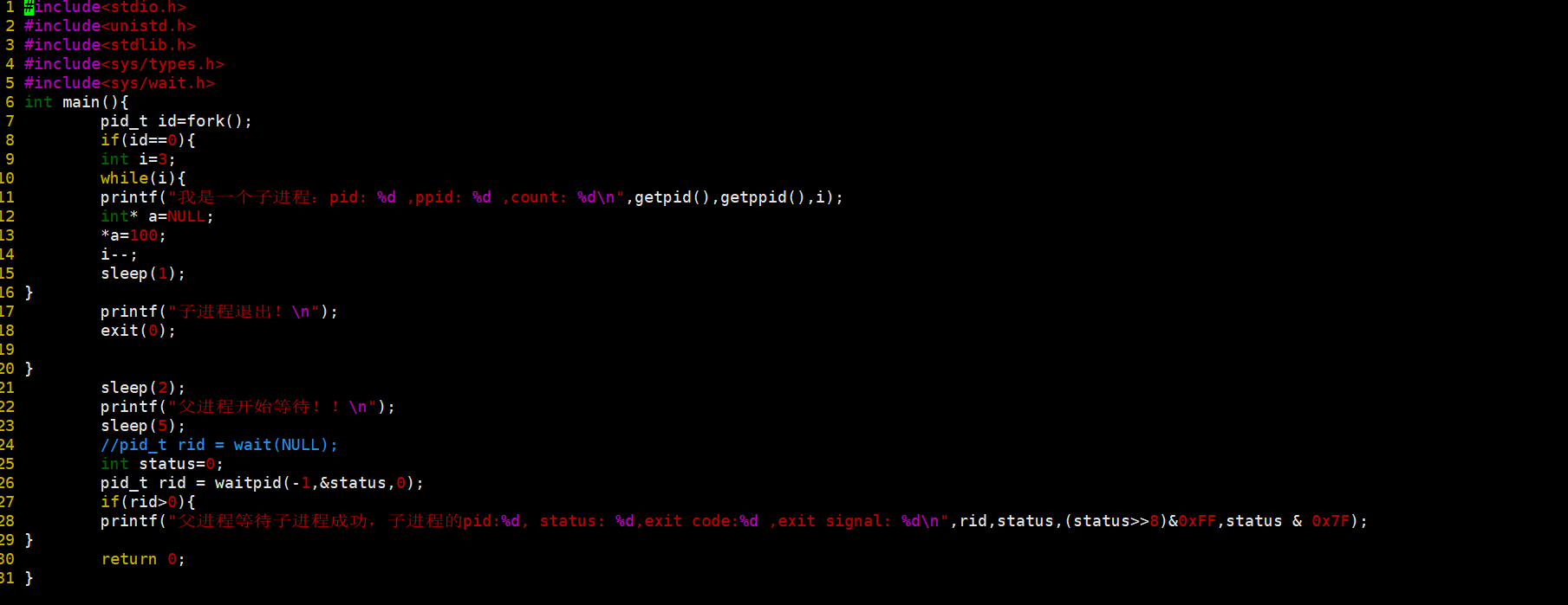 我们故意写一个异常,我们看看退出信号怎么变化。(纠正一下上图的错误,status>0x7F应该是status&0x7F)