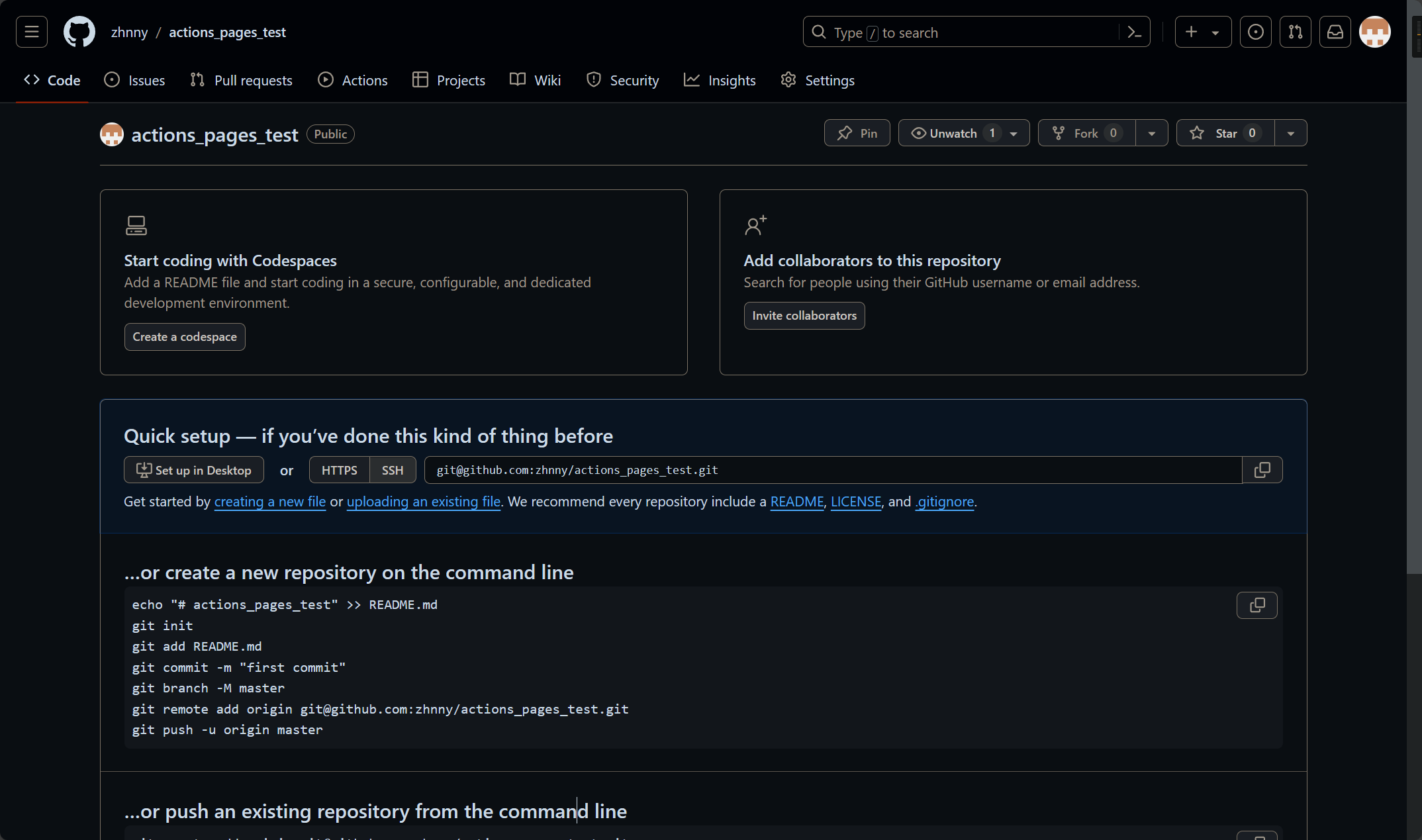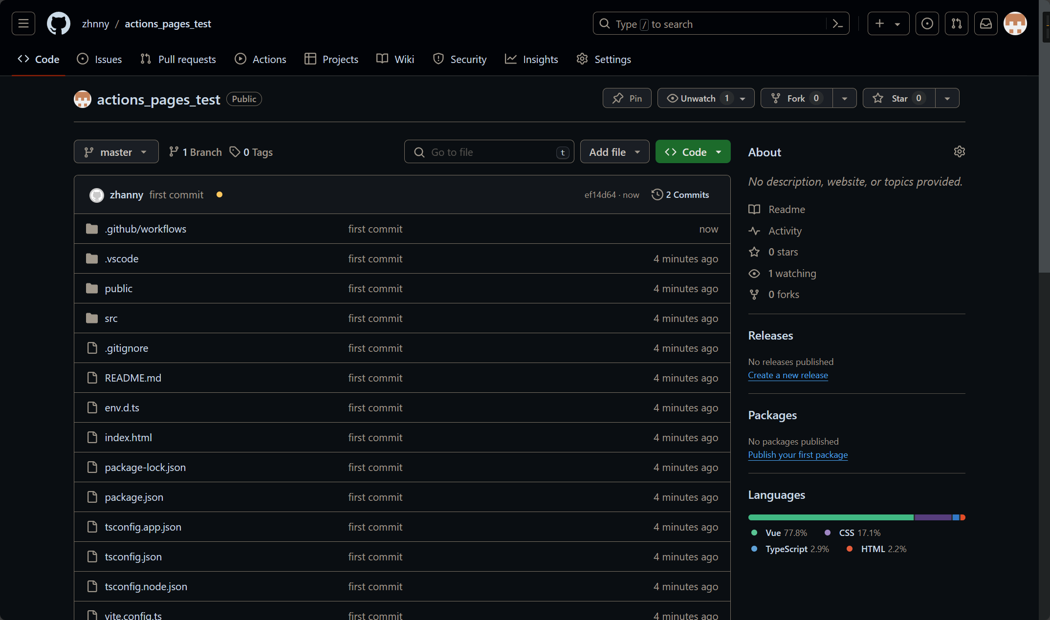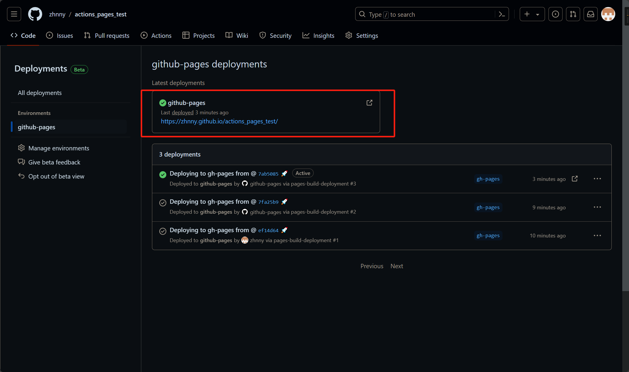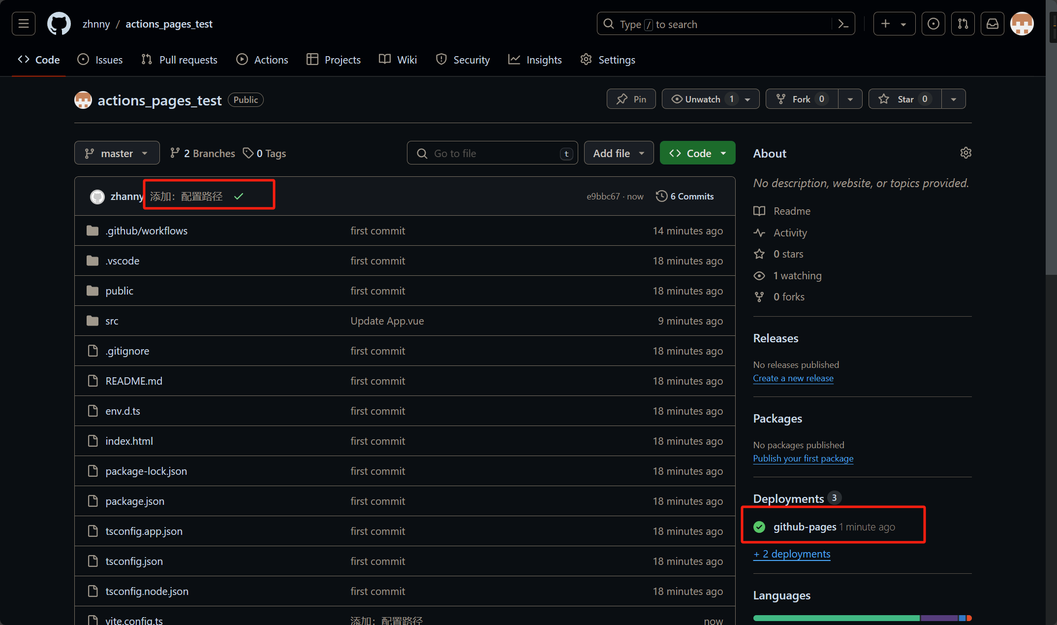 此时提交代码,就会自动推送到网站https://<GitHub账户名>.github.io/actions_pages_test/