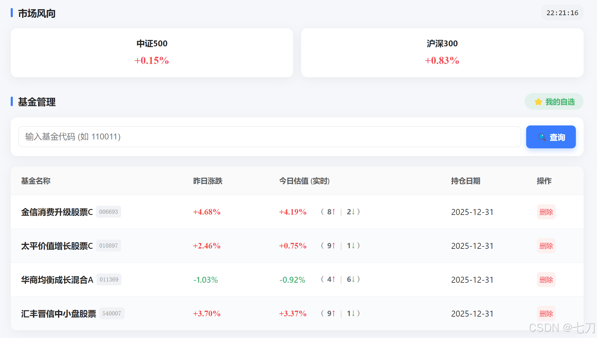 - 列表展示:加载页面时自动获取所有自选基金的最新实时数据。