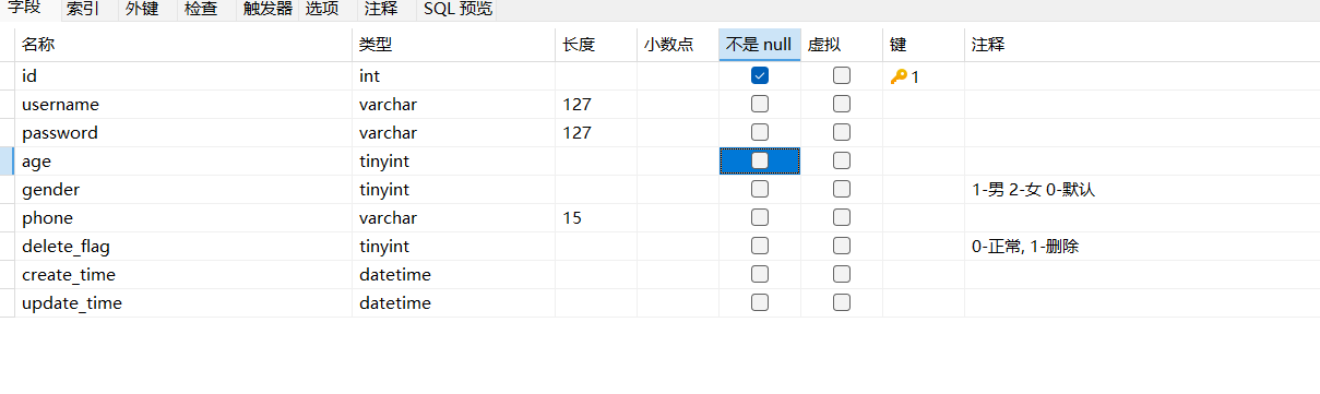 咱们为了更好的演示,先来到数据库这里把所有的属性设置成可以为空。