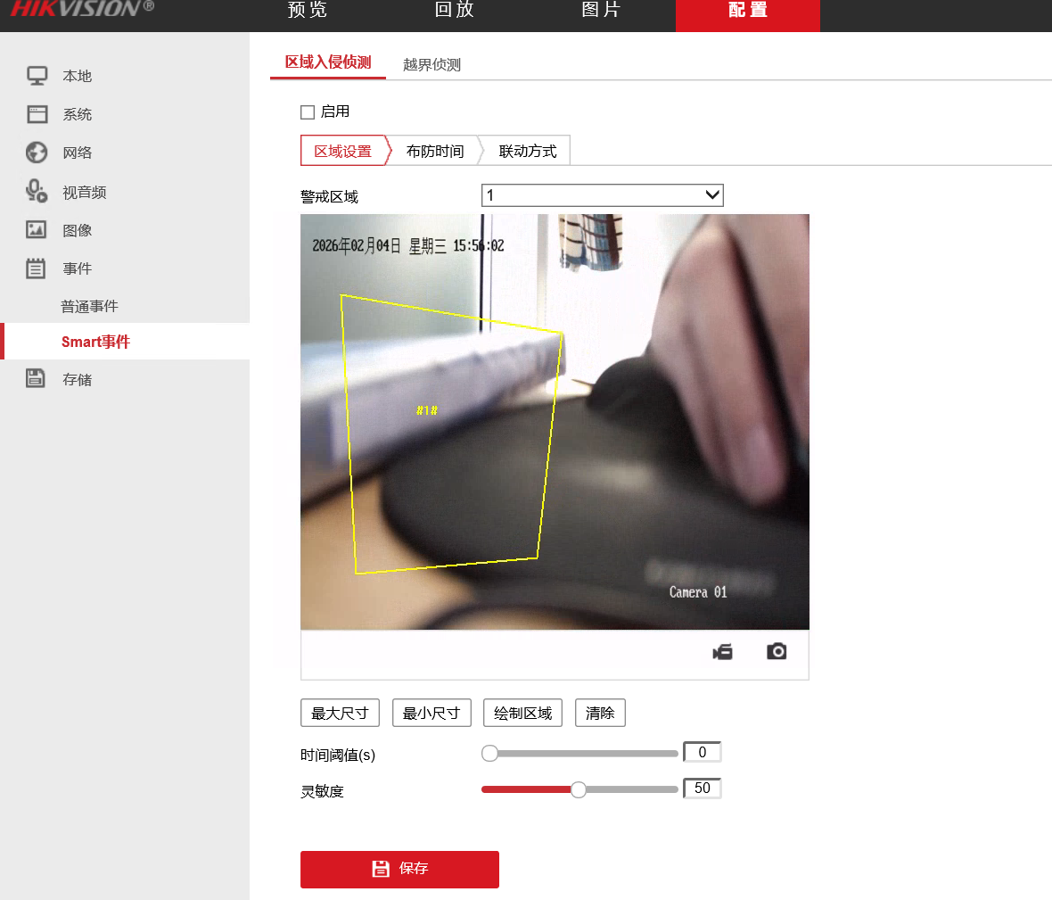 我的摄像机不支持人形检查和车辆检测,所以我就在后台设置了一个简单的区域入侵检测,如下图所示,我施划了这个区域的多边形。