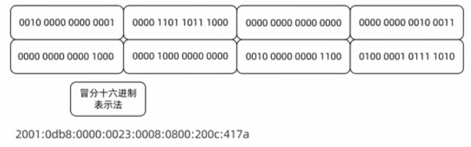 - IPv6分为8段表示,每段每四位编码成一个十六进制位表示,数之间用冒号(:)分开。