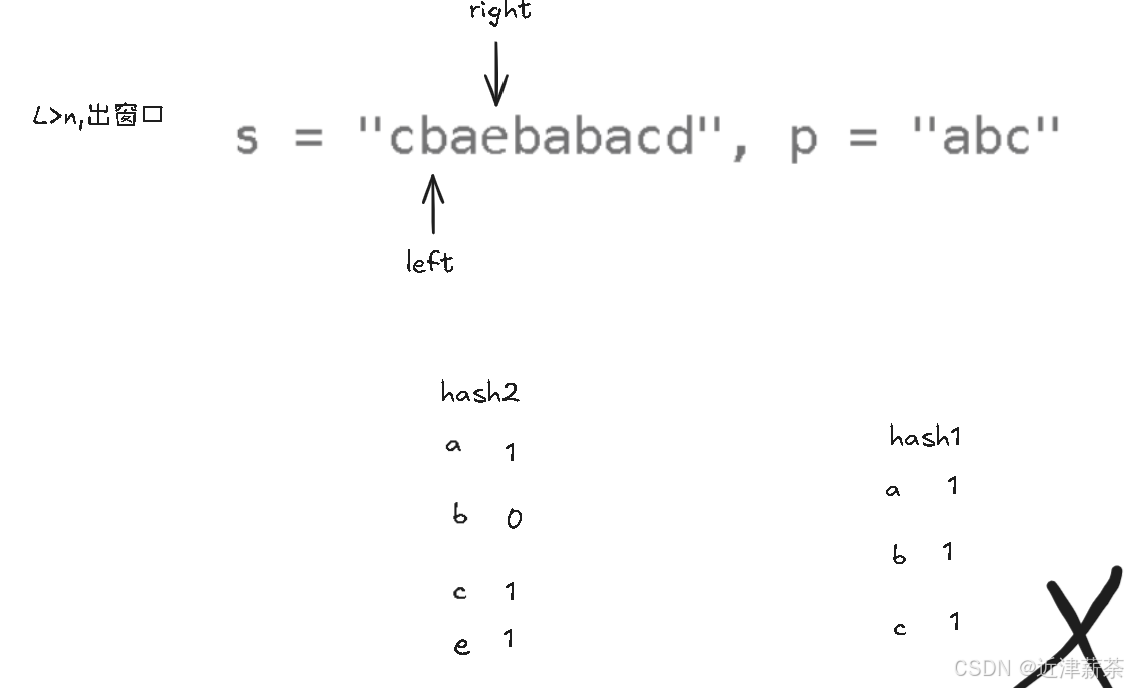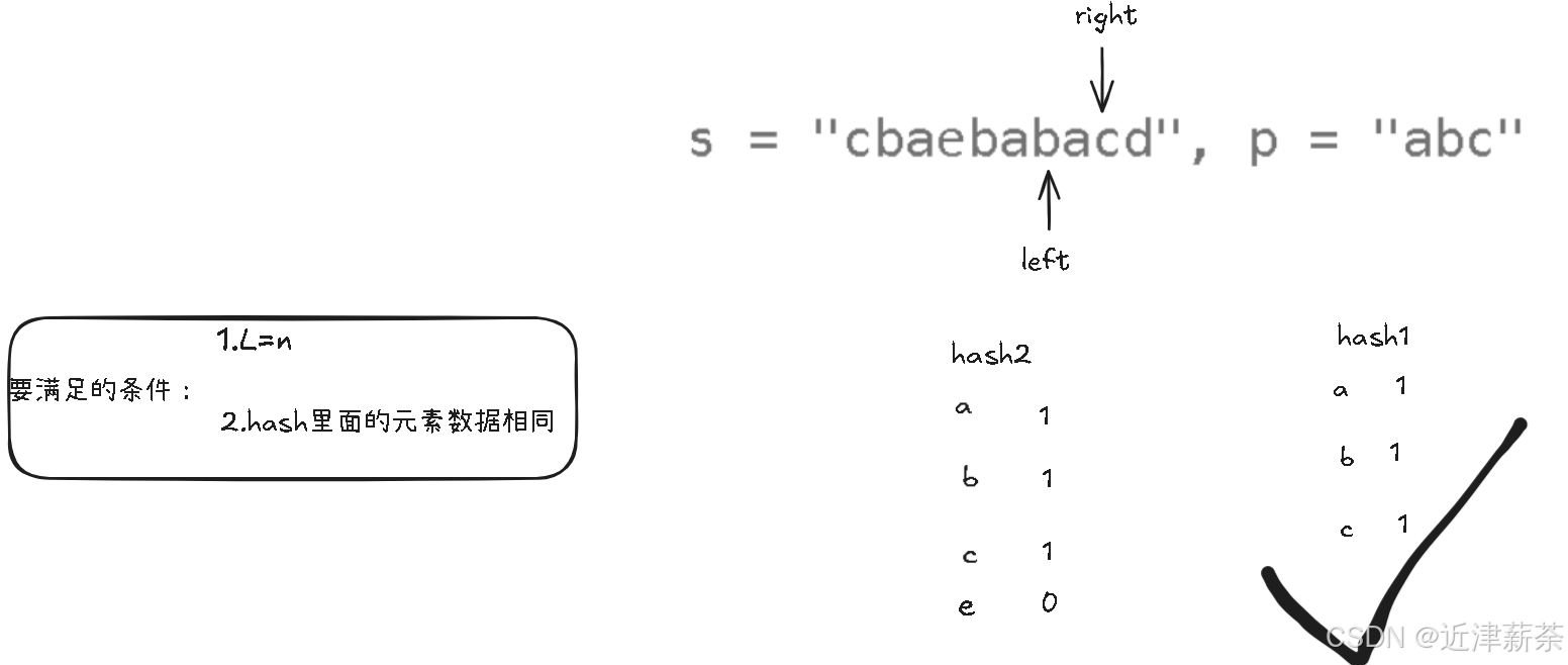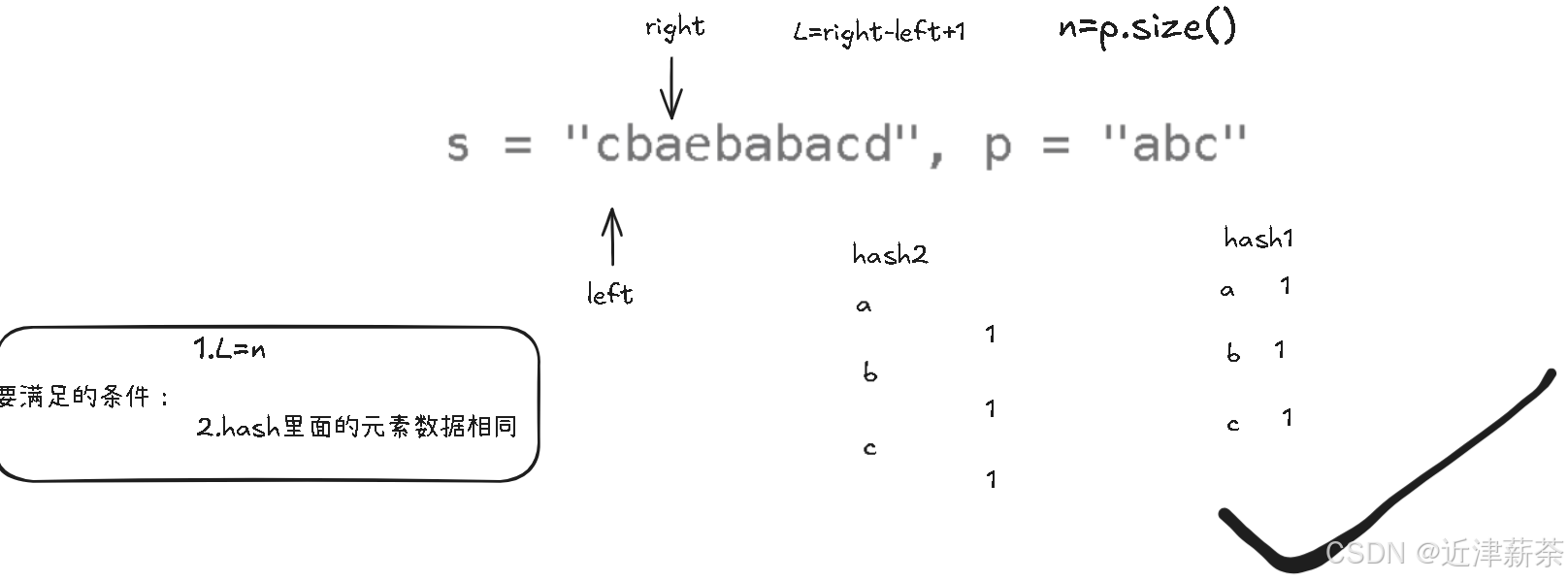 并且我们发现,当有效数据的个数和hash1中的数据个数相同,且L=n的时候。此时的子串完全符合要求。
