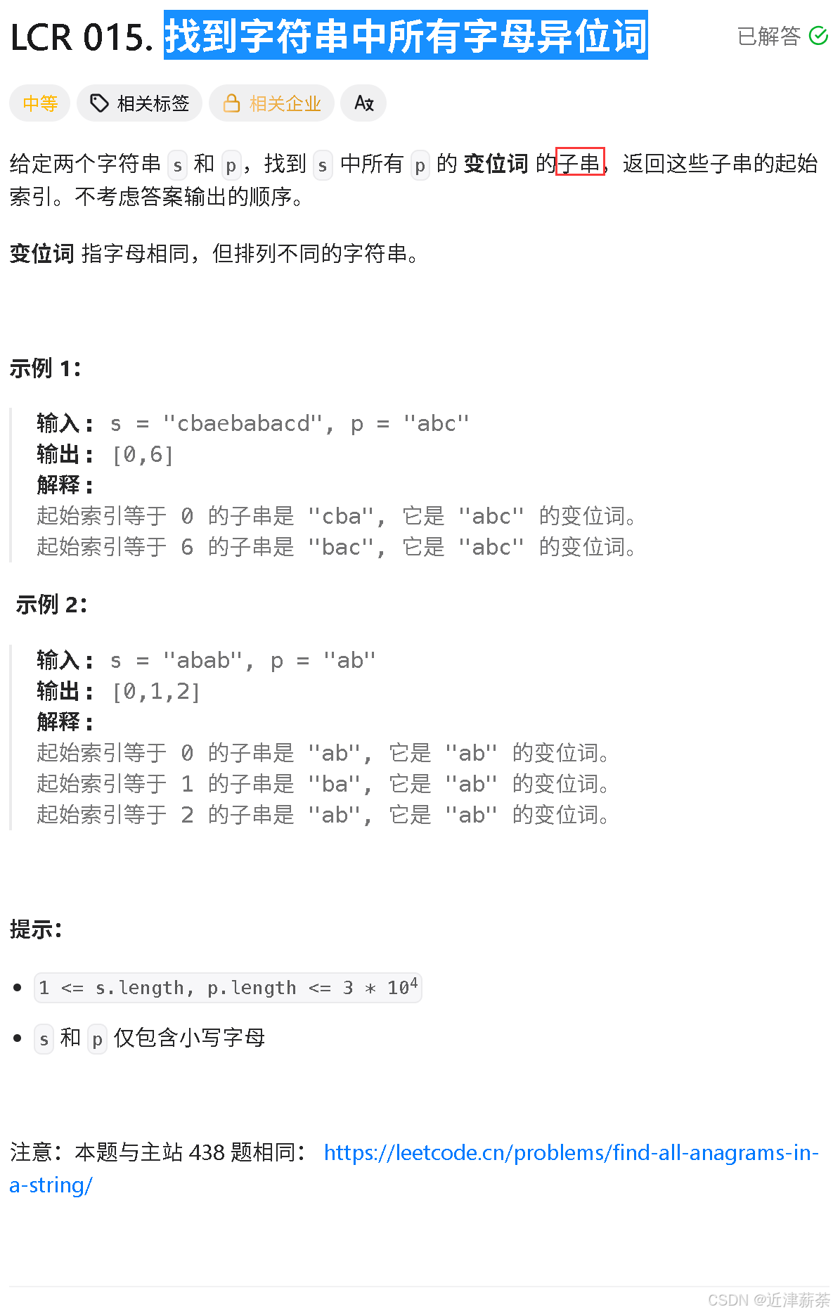 - 异位词 :相 *同字母排列组合*形成的字符串