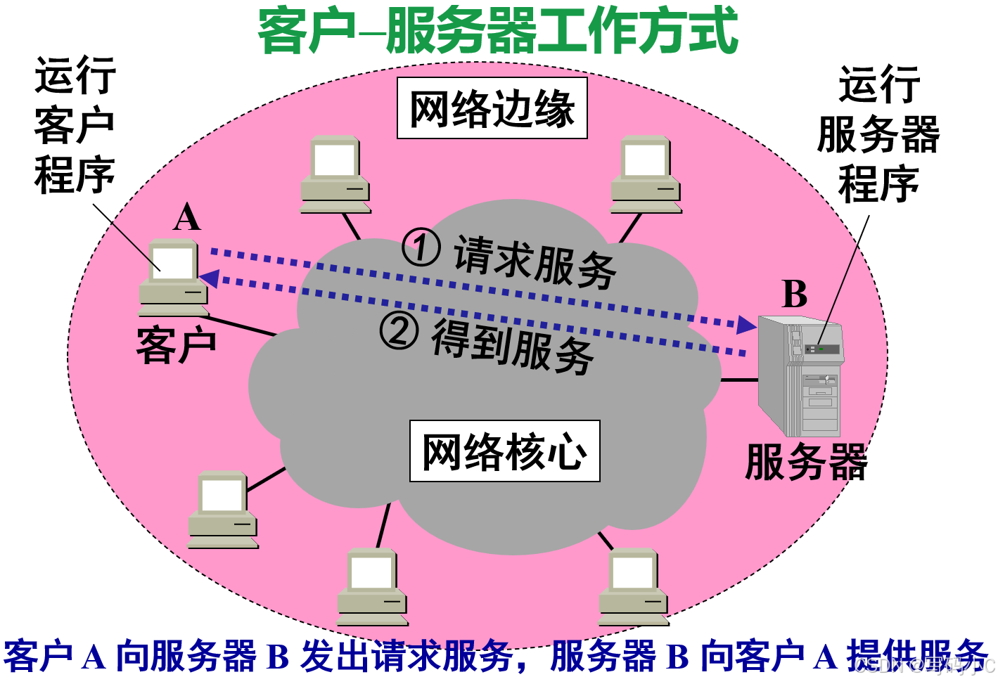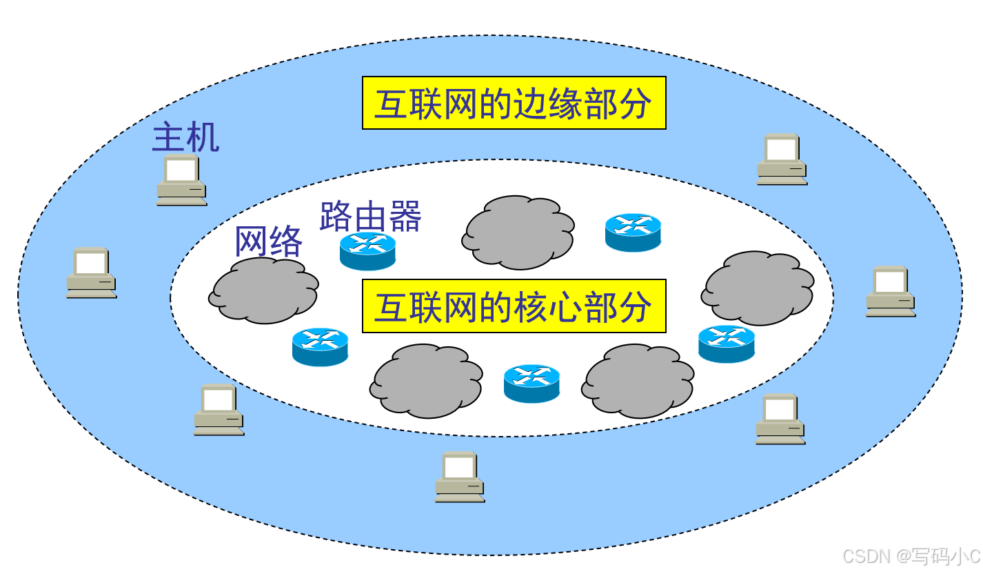 - 边缘部分:由所有连接在互联网上的主机组成。这部分是用户直接使用的,用于进行通信(传送数据、音频或视频)和资源共享。