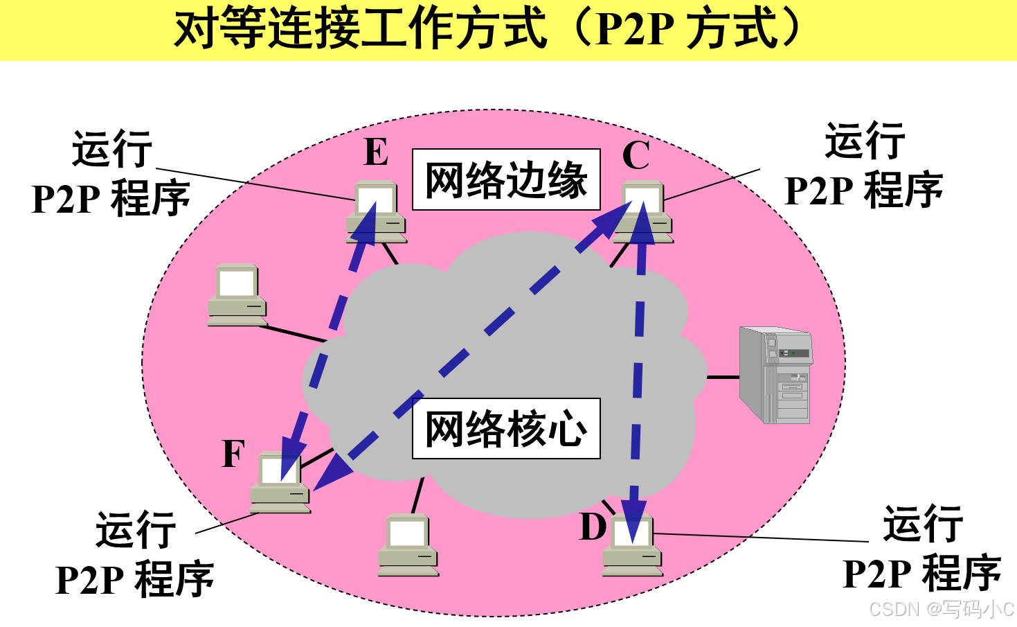 对等连接(Peer-to-Peer,简称的 P2P)是指两个主机在通信时不区分哪一个是服务请求方还是服务提供方。只要两个主机都运行了对等连接软件(P2P 软件),它们就可以进行平等的、对等连接通信。双方都可以下载对方已经存储在硬盘中的共享文档。