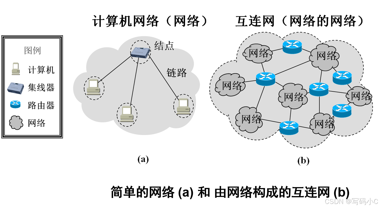 互连网(Internet)则是"网络的网络"(Network of Networks)。它通过路由器将多个网络连接起来,从而构成一个覆盖范围更广的通信网络。