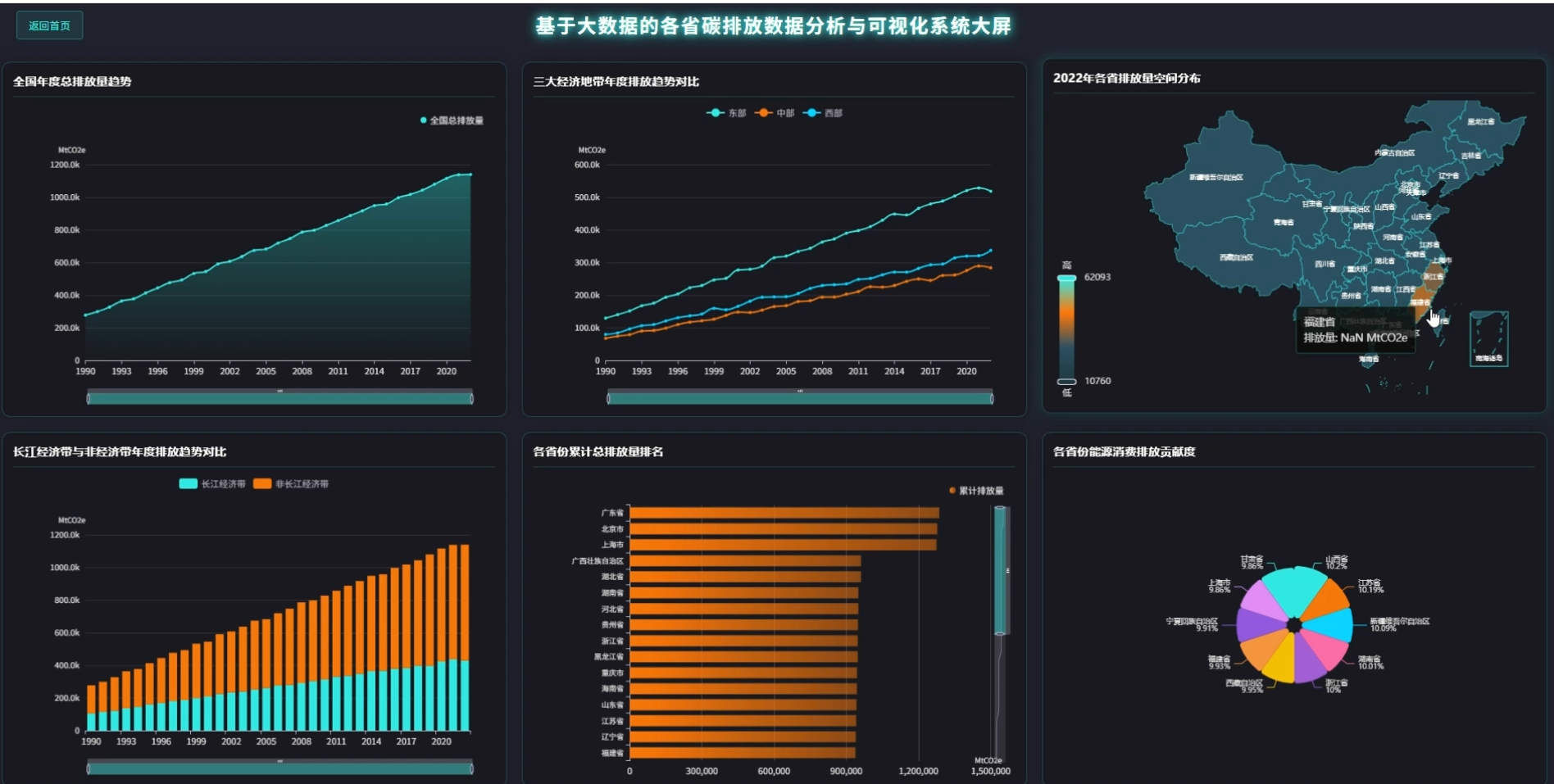 本系统《基于大数据的各省碳排放数据分析与可视化系统》是专为计算机专业毕业生设计的一套综合性数据分析平台。系统采用Python语言开发,深度融合了大数据处理技术,利用Spark分布式计算框架对海量历史碳排放数据进行清洗、转换与高效计算,克服了传统工具处理大规模数据时的性能瓶颈。在功能实现上,系统集成了时间维度的趋势演变分析、空间维度的区域格局对比以及排放结构维度的深度拆解,能够全方位、多角度地展示各省及重点区域的碳排放现状。前端界面采用可视化技术,将复杂的数据结果以直观的图表形式呈现,不仅解决了毕设项目中"数据展示不直观"的难题,更体现了从数据采集、处理到展示的全流程技术能力,是一个兼具技术深度与实用价值的高质量毕设项目。