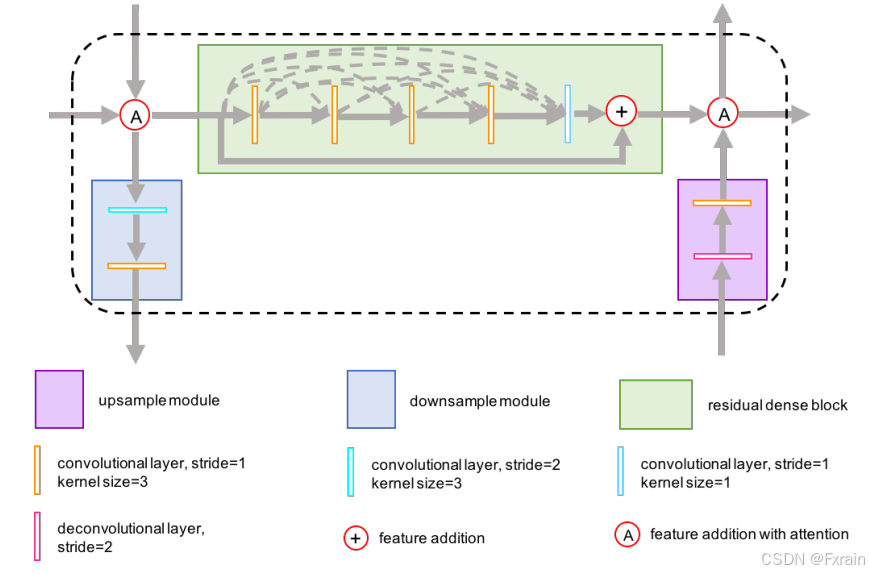 骨干模块是GridNet的增强版本,最初是为语义分割而提出的。它根据预处理模块生成的学习输入执行基于注意力的多尺度估计。这里我们选择具有三行六列的网格网络。每一行对应于不同的比例,并由保持特征映射数量不变的五个RDB块组成。每列可以被视为通过上采样/下采样块连接不同刻度的桥。在每个上采样 (下采样) 块中,特征映射的大小减少 (增加) 2倍,而特征映射的数量增加 (减少) 相同的因子。这里的上采样/下采样是使用卷积层而不是诸如双线性或双插值之类的传统方法来实现的。下面提供了关于RDB块,上采样块和下采样块的详细的插图(图3):