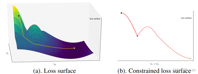 下图(图1)中我们专注于单个像素的两种颜色通道,并通过t1和t2对各自的透射图进行降噪。图(a)绘制了作为t1和t2的函数的loss表面。可以看出,全局最小值达到了满足t1 = t2的点 (绿点),这与大气散射模型一致。黑点作为起始点,可以通过梯度下降找到全局最小点(见黄色路径)。然而,基于沿t1 = t2方向的大气散射模型的区域限制搜索 (见红色路径) 将在紫色点指示的点处卡住 (见图2(b))。该点是受限空间中的局部最小值 ,而不是原始空间中的局部最小值,并且仅由于采用了大气散射模型而成为障碍。
