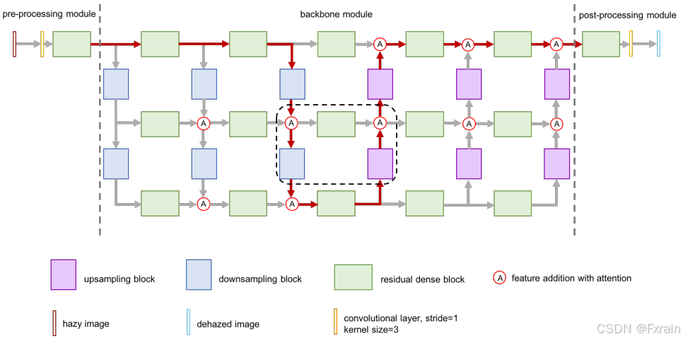 直接从骨干模块的输出构建的去雾图像倾向于包含伪像。因此,通过后处理模块提高去雾图像的质量。后处理模块的结构与预处理模块的结构对称。