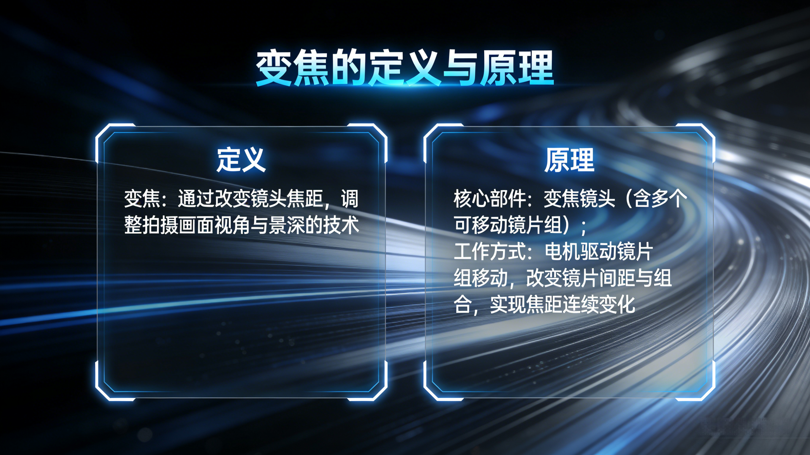 - 原理 :移动镜头内部镜片组,改变镜头到成像传感器的距离(像距),使来自某物距的光线精准汇聚在传感器上。