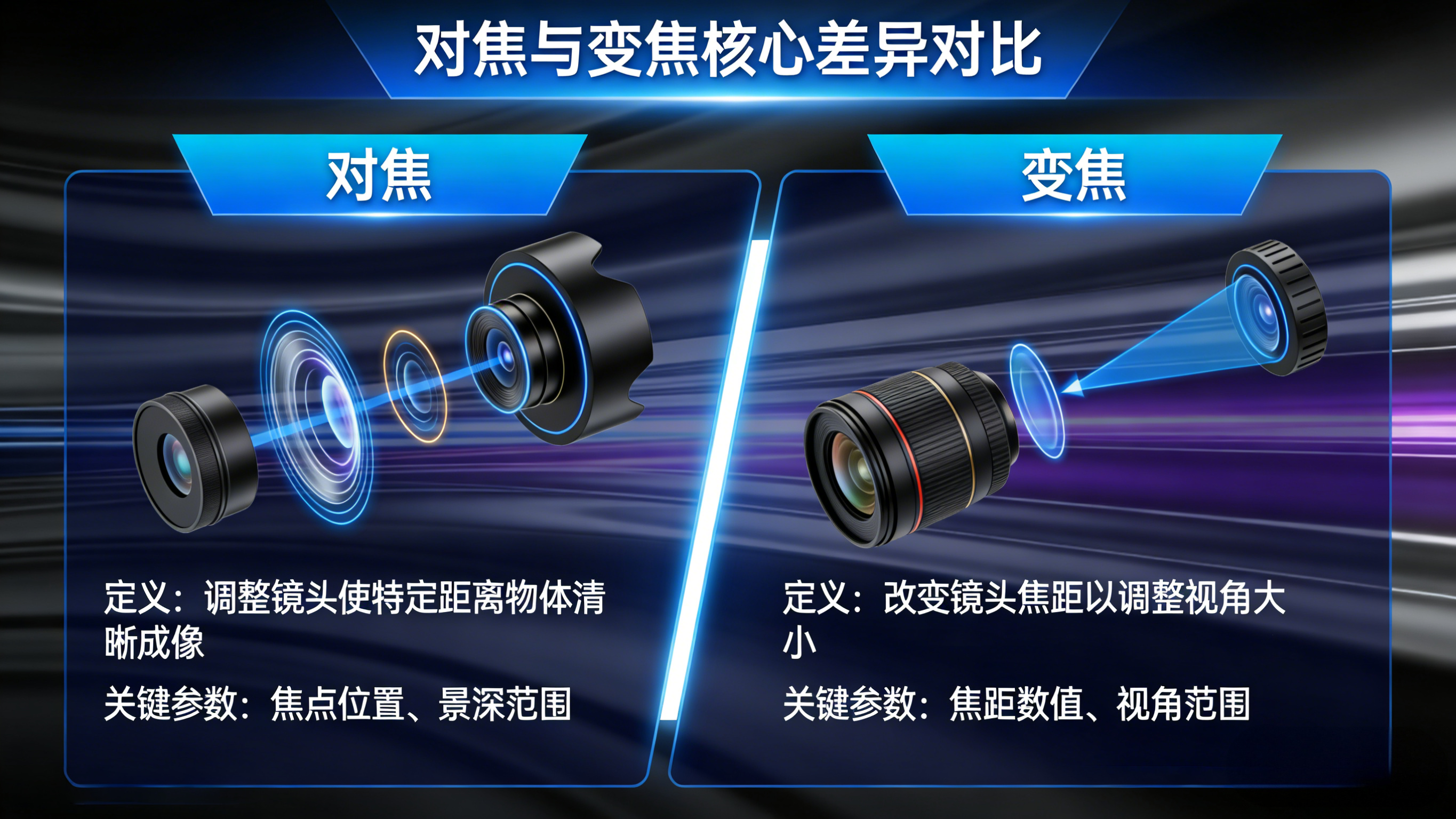 "对焦"(Focus)和"变焦"(Zoom)是摄影和机器视觉中两个 完全不同但常被混淆 的概念。简单来说: