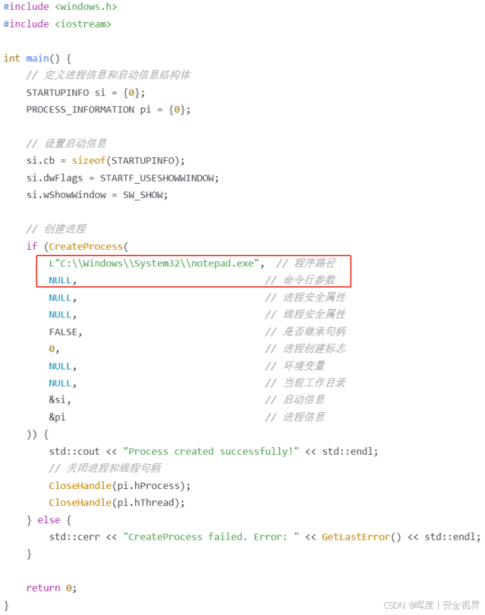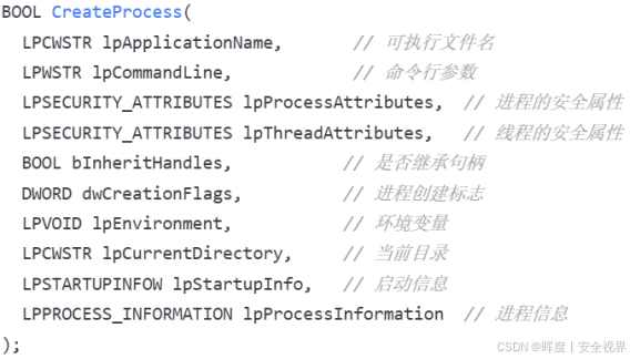 | lpProcessAttributes | LPSECURITY_ATTRIBUTES | 指向新进程安全属性 的指针,控制句柄继承性。通常传入NULL。 |