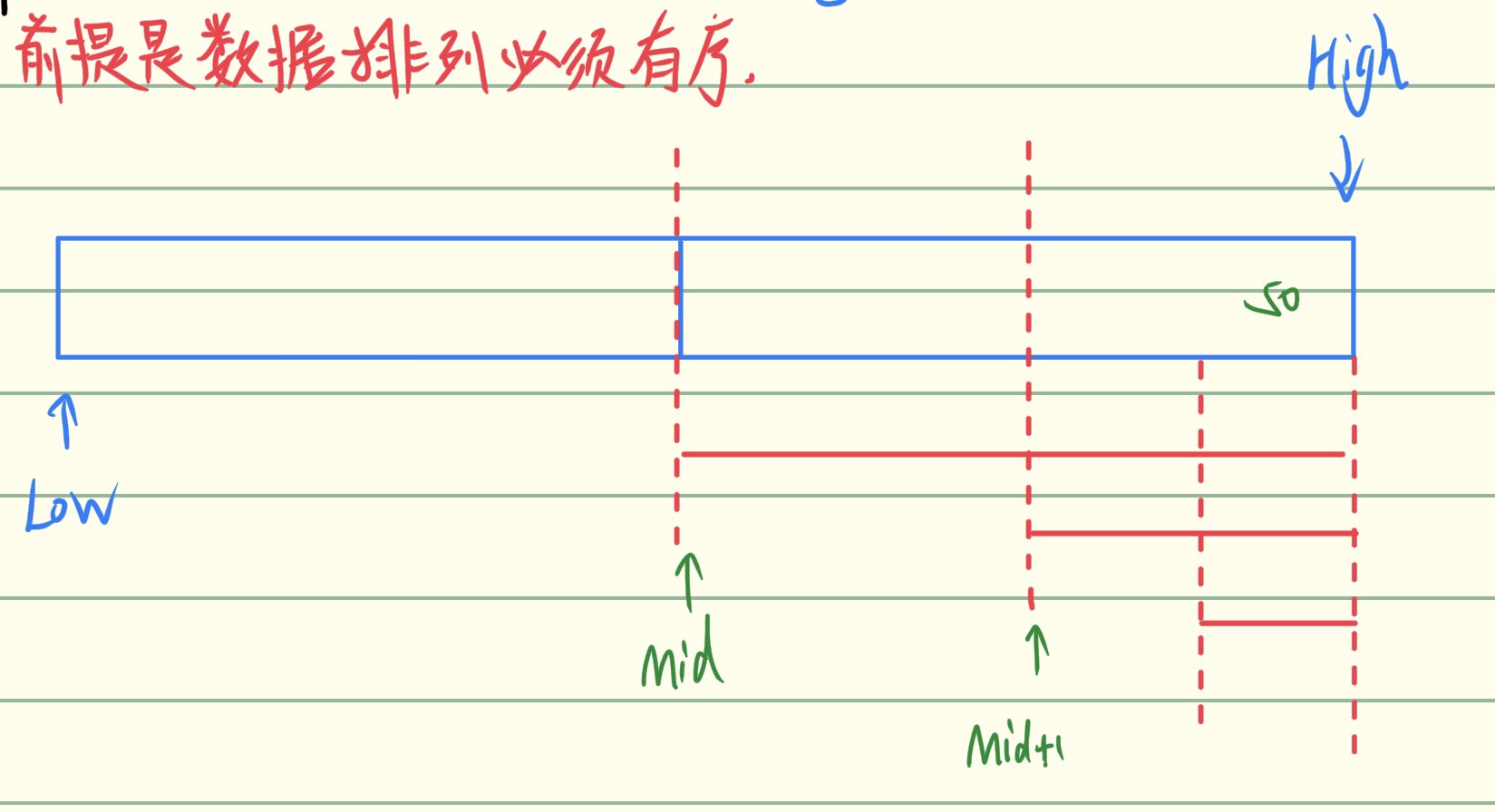前提是数据排列必须有序;时间复杂度为O(logn)
