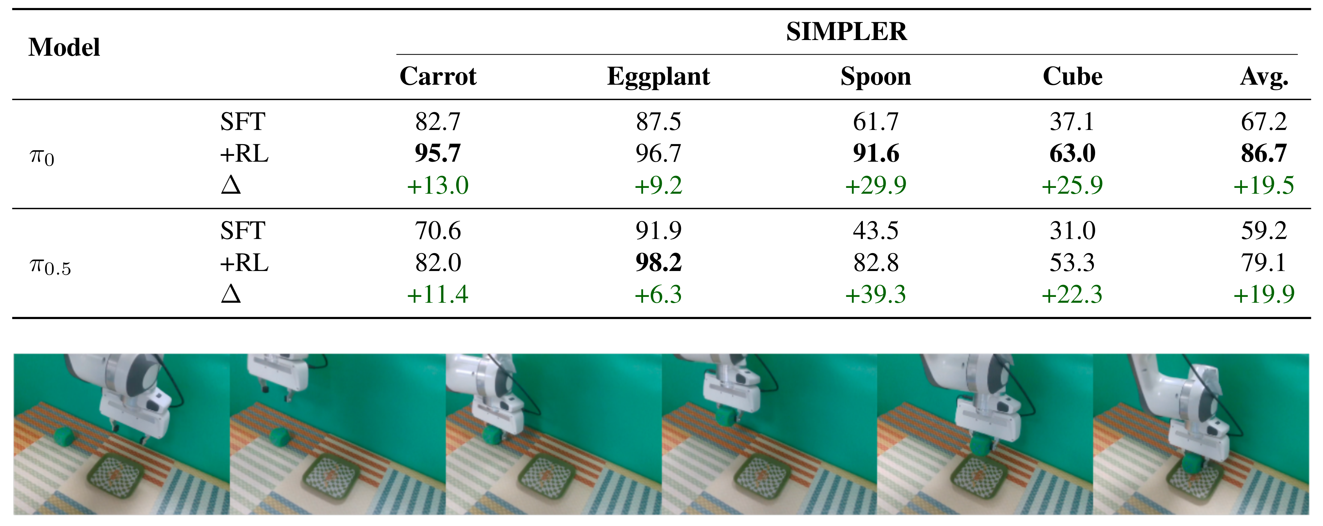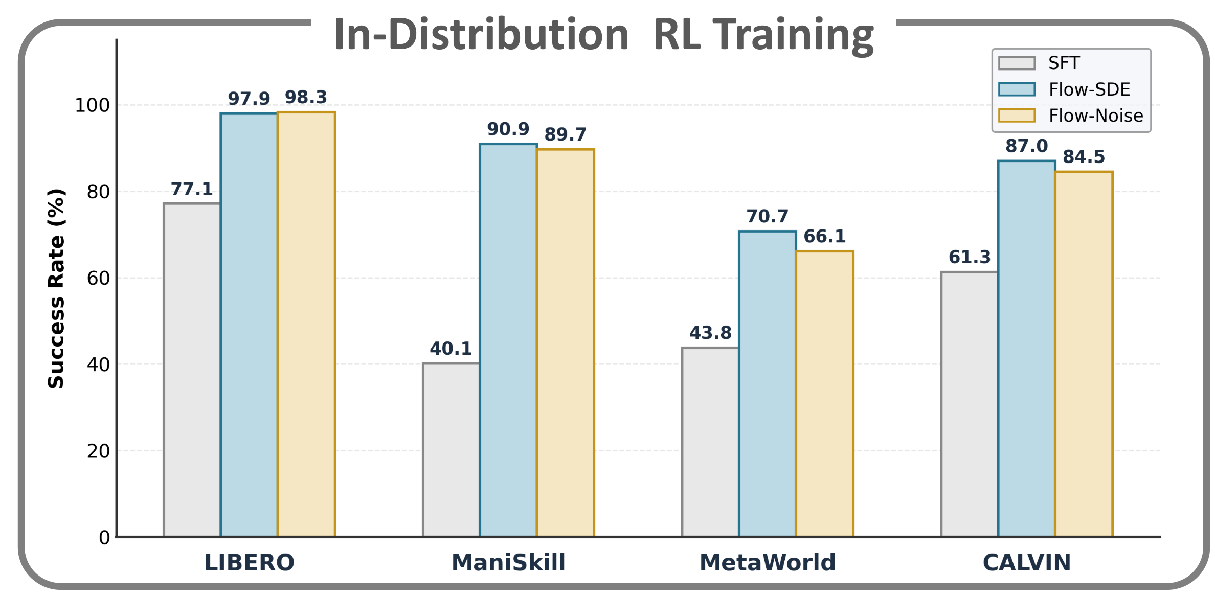 - LIBERO:SFT(77.1)→ Flow-SDE(97.9)/Flow-Noise(98.3),提升超 20%