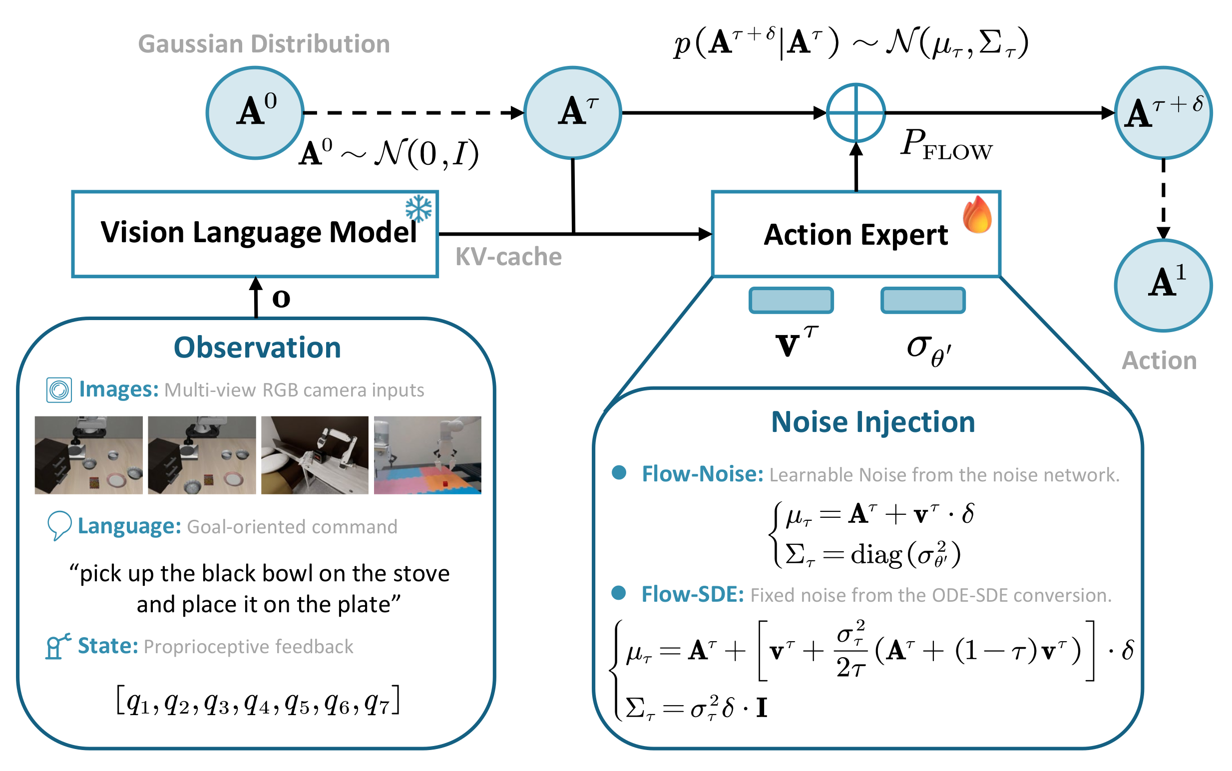 展示了 "多模态观测→多模态理解→动作生成 + 噪声注入→最终动作输出"的链路,同时明确了 Flow-Noise 与 Flow-SDE 的核心差异