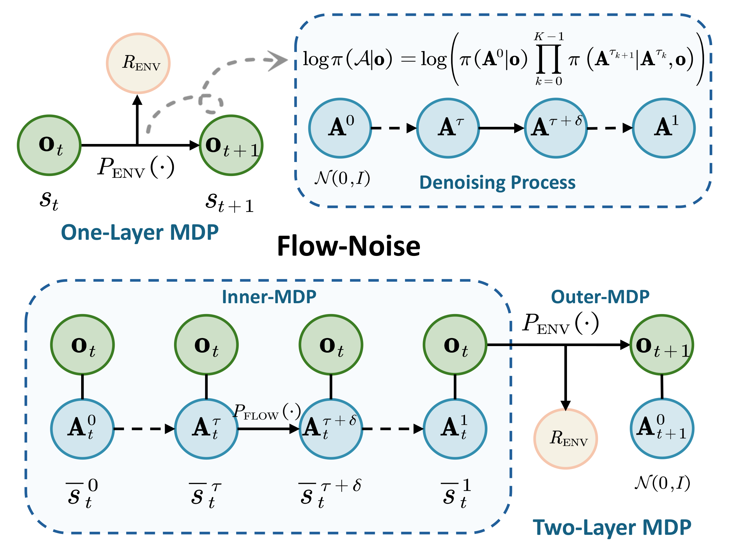 - Flow-Noise(单层 MDP) :将「去噪过程 + 环境交互」合并为单层 MDP------以观测 (o_t) 作为状态,环境转移至 (o_{t+1});同时把去噪的对数似然拆分为初始噪声似然 × 各步骤转移似然,通过单层 MDP 简化计算,直接关联动作生成与环境奖励。