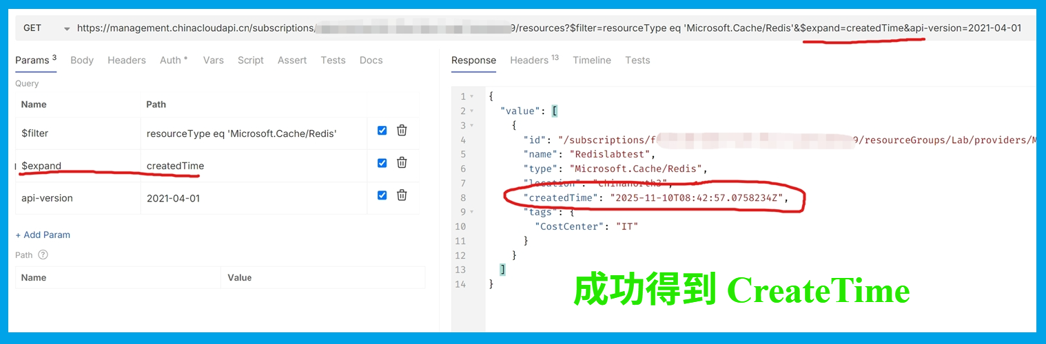 尽管 Redis 资源的 GET API 不返回创建时间,但 Azure Resource Manager(ARM) 层面的 Resources List API 支持通过 $expand=createdTime 获取时间信息: