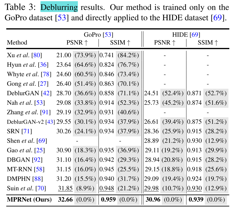 我们的MPRNet是端到端可训练的,不需要预训练。我们为三个不同的任务训练不同的模型。我们在编码器-解码器的每个尺度上使用2个 CAB,对于下采样,我们使用2×2 max-pooling,步幅为2。在最后阶段,我们使用包含 3 个 ORB 的 ORSNet,每个 ORB 进一步使用 8 个 CAB。根据任务的复杂性,我们通过设置通道数来扩展网络宽度,将通道数设置为40个用于去噪,80个用于去模糊,96个用于去模糊。网络在256×256 patch 上进行训练,对于