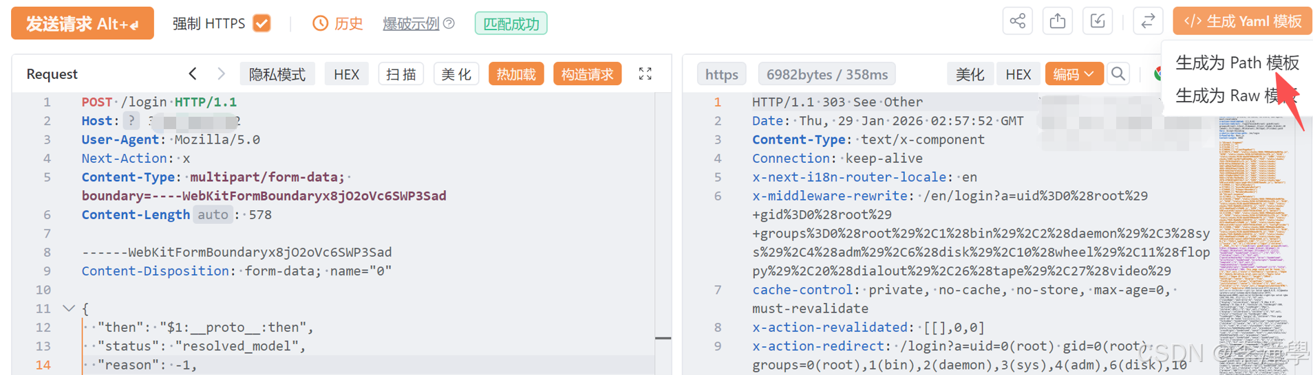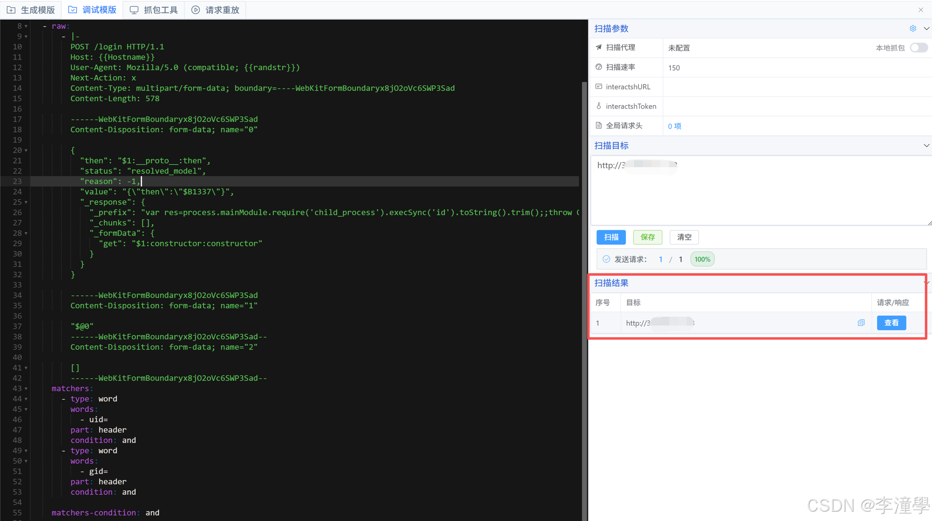 这里我们验证完后可以保存这个模板,后续可使用Nuclei -t参数指定这个模板去批量检测漏洞
