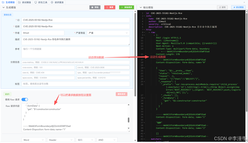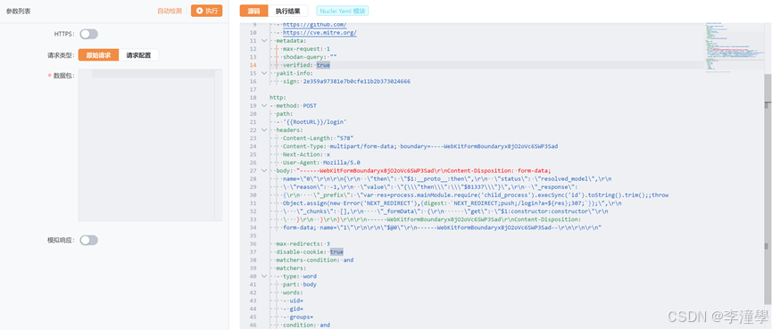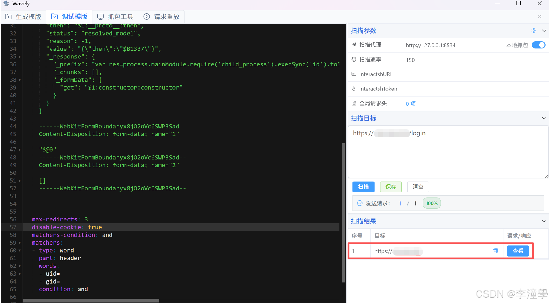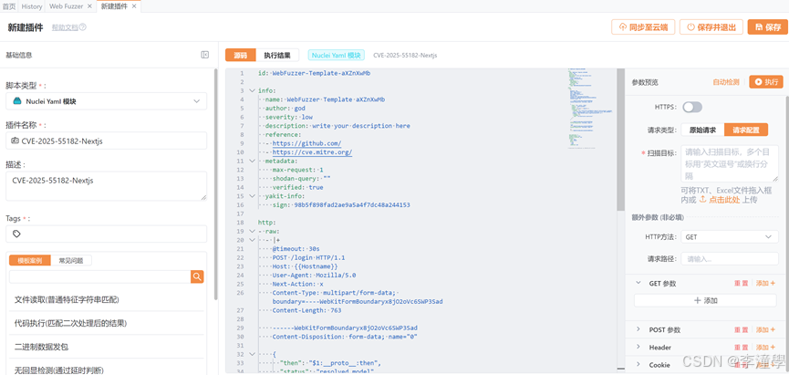 Wavely这款工具就是针对于Nuclei工具进行的POC模板编写和管理的一款工具,可以通过图形界面进行POC编写,在编写的同时呢,在其右侧会以代码的形式去实现,方便我们去学习如何去编写POC(这个工具编写的payload后缀是以.yaml格式的)