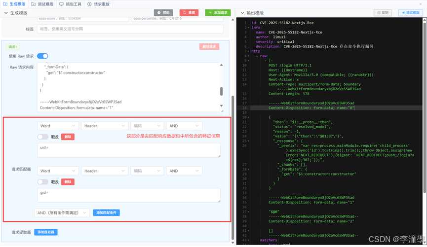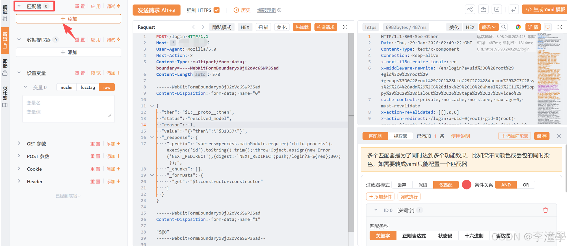 还是先返回到Yakit工具上面,我们用yakit去复现漏洞,但是如何去利用它编写和生成一个可用于Nuclei扫描脚本呢,yakit工具里面有一个原生的规则叫做匹配器