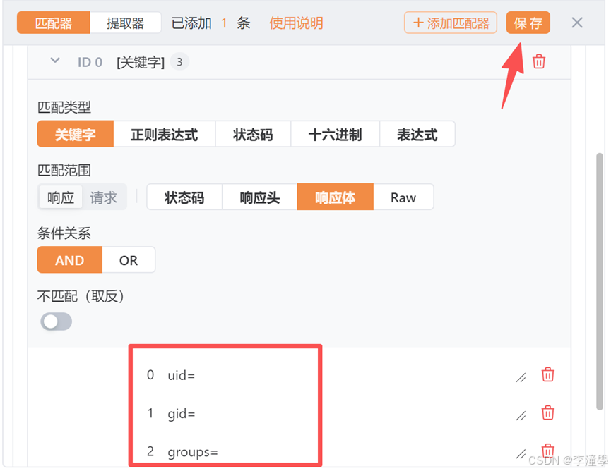 像我们如果进行命令执行的话,在匹配条件这里填写回显特征部分信息就可以了,进行保存