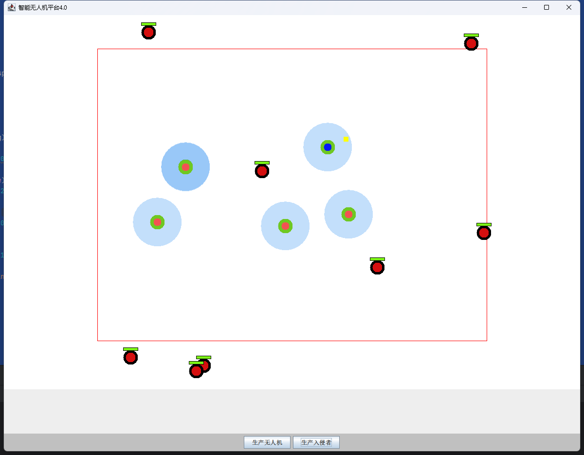 在V3版本中,实现了无人机的自动索敌追踪、并在扫描到入侵者后将信息"广播"给其他无人机,其他巡逻状态的无人机可以协同该无人机进行"围剿"行为。