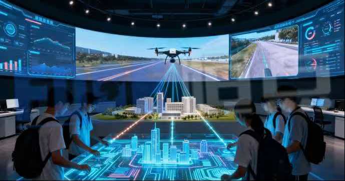 实训室首推的无人机城市管理多维认知体验系统,彻底改变了传统教学中抽象、枯燥的认知模式。这一系统通过创新的多维交互手段,帮助学生建立对无人机城市管理设备与场景的直观、立体认知。