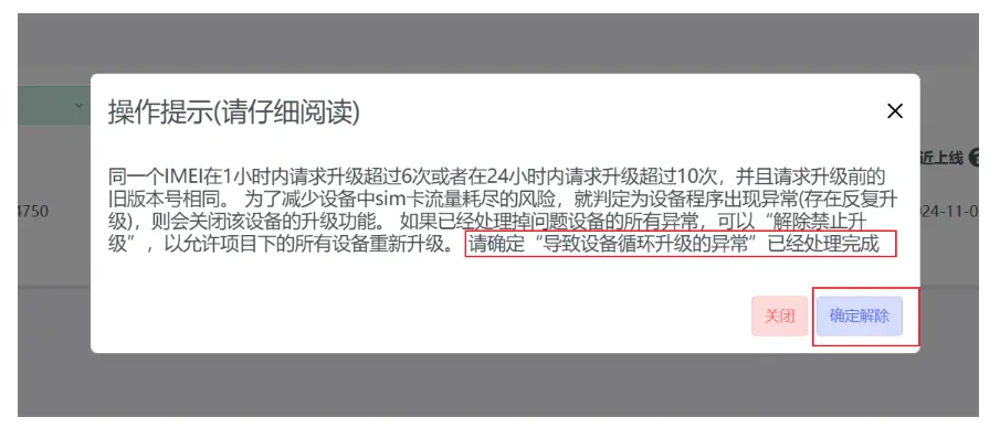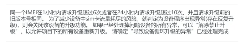 确定"导致设备循环升级的异常"已经处理完成后,点击确定解除,即可解除限制升级