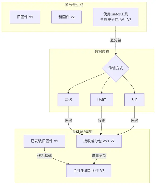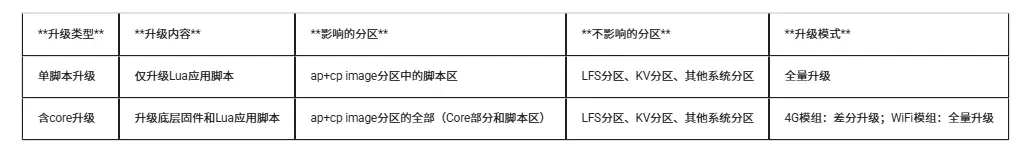内核固件:需分情况对待,4G 模组系列比如 Air780EXX 系列、Air724UG、Air8000 系列等仅支持差分升级,wifi 模组 Air8101/Air8101A 是全量升级