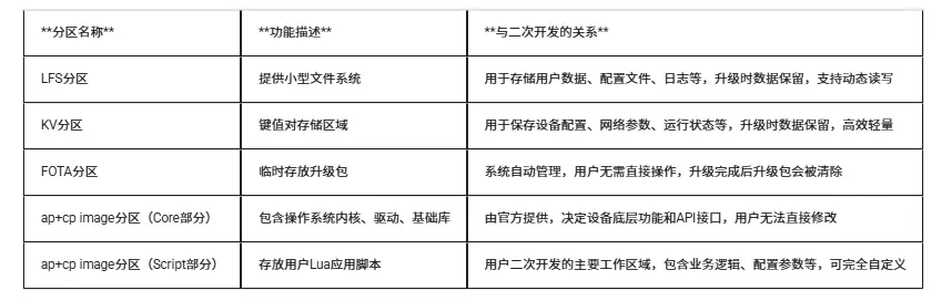 大家可以看到,flash 中分区很多,但作为 LuatOS 开发者,我们主要关注其中四个"房间":ap+cp image 分区(包含脚本代码区)、LFS 分区、KV 分区和 FOTA 分区
