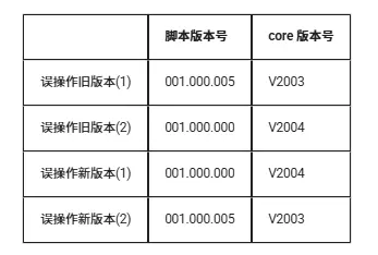 然后误操作旧版本(1) 和误操作新版本(1)进行差分,这样虽然脚本版本号旧版本大于了新版本,但是 core 的旧版本小于新版本,所以升级平台依旧认为是依次有效的升级,下发了升级包。