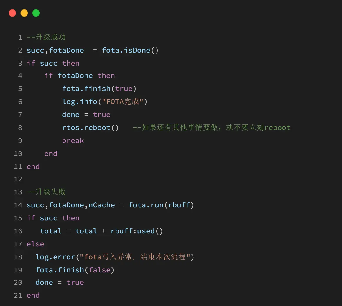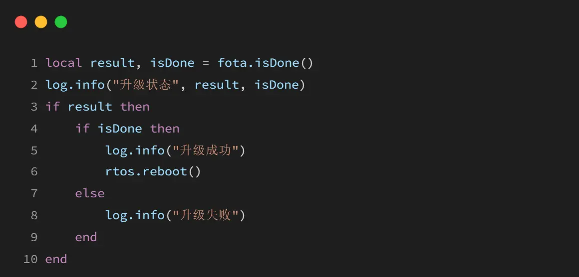 下载升级包成功(result 为 0)后,通常需要调用 rtos.reboot() 重启设备以更新。你可以根据需要延迟重启。