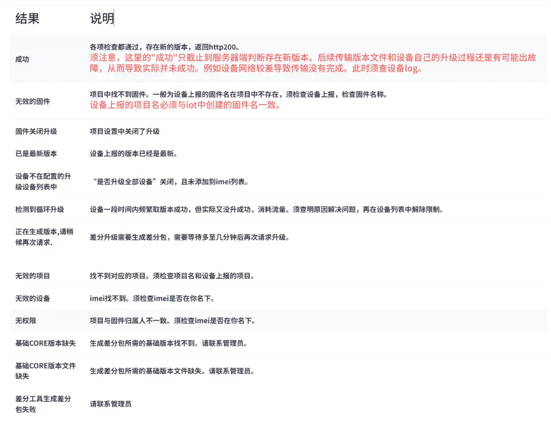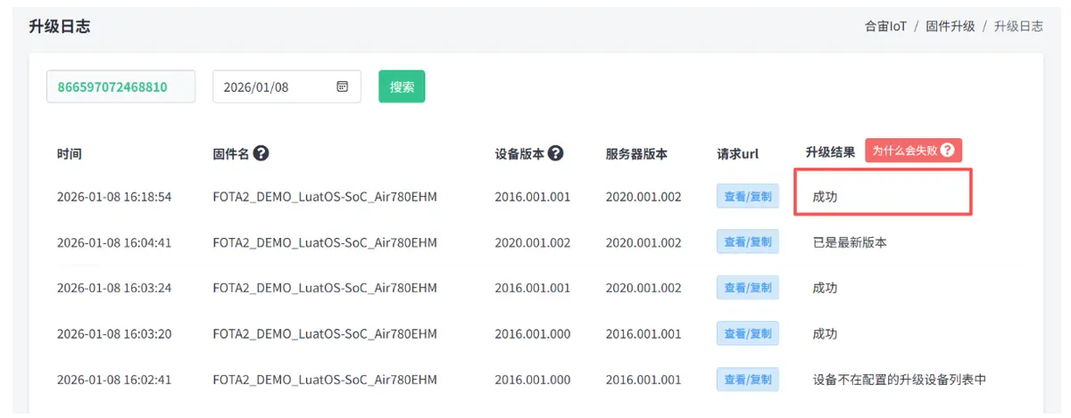 升级失败可以在 iot 平台中打开 固件升级 -> 升级日志 页面,输入 iemi 来查看下升级失败的原因是什么。
