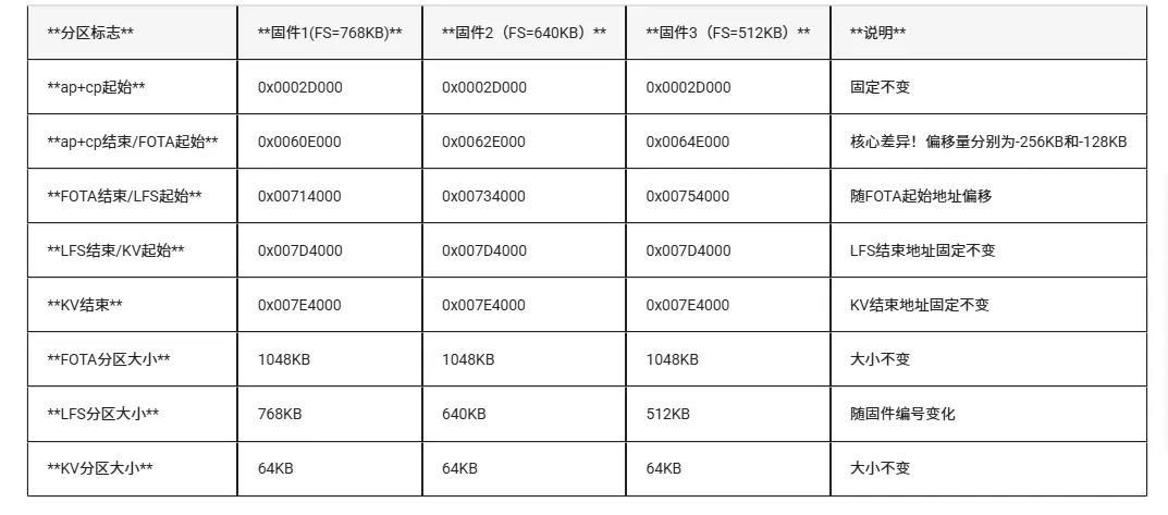 在不同编号的固件版本规划中,为了容纳不同的功能,其整个 Flash 的分区表布局(包括 FOTA、AP、CP、LFS 等分区的起始地址和大小)是预先定义好且固定的。因此,不同编号的固件,其 FOTA 分区大小可能相同也可能不同,但更关键的是其在整个 Flash 中的"位置"(地址)不同。所以具体 fota 分区大小可以看 1.5 章节具体表格。