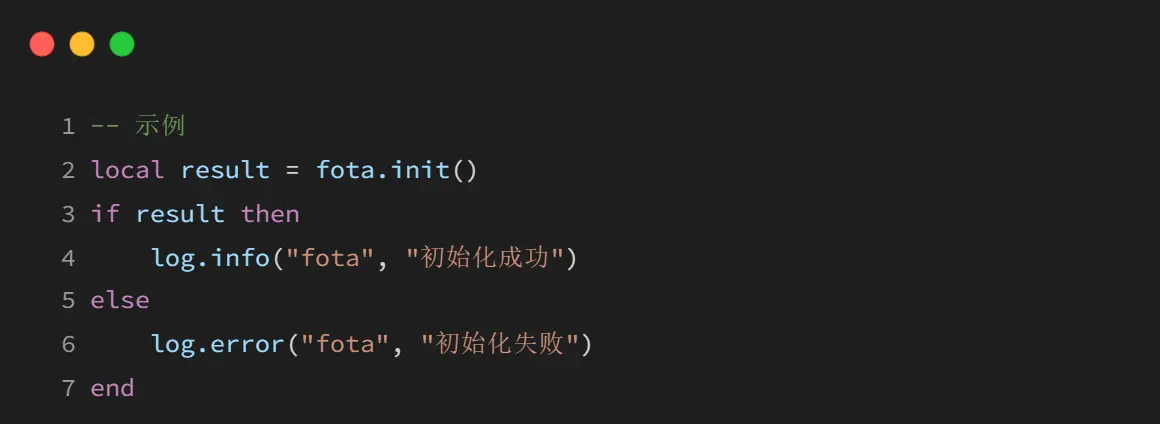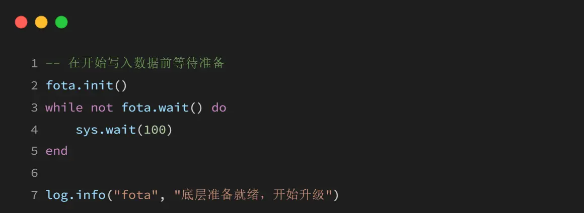初始化 FOTA → 下载升级包 → 写入 FOTA 分区 → MD5 校验 → 设置升级标志 → 重启