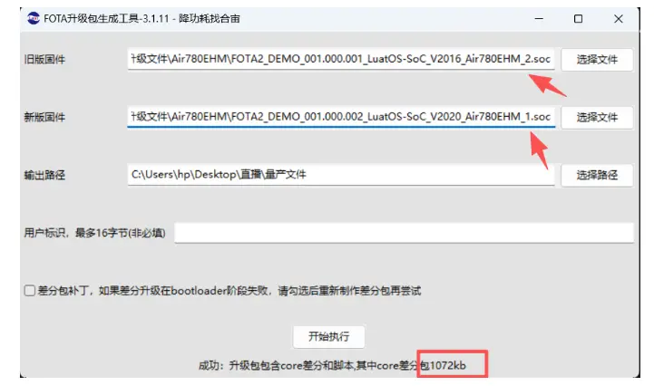对于远程升级来说, 必须用 Luatools 内置的差分包制作工具, 输入两个不同版本的 soc文件, 生成一个.bin 结尾的差分包,才能上传到 IOT 后台进行远程升级。