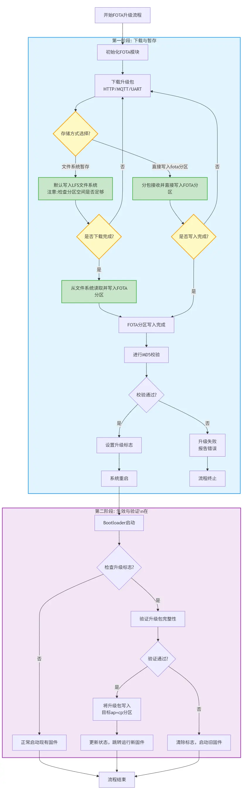 重启后:Bootloader 检查升级标志 → 验证升级包 → 写入目标分区 → 启动新固件 → 验证新固件