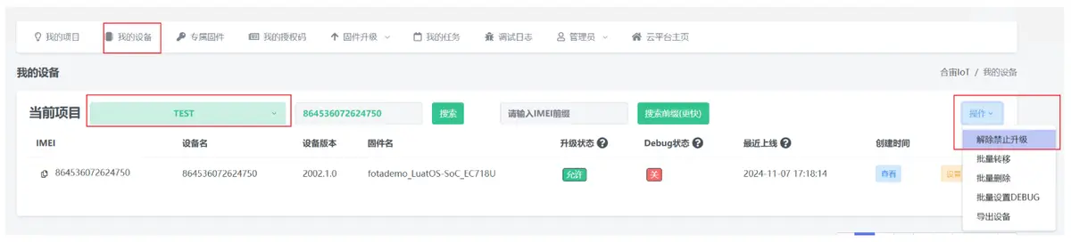 在"我的设备"中选择升级 imei 所在的项目,然后点击右边的"解除禁止升级",