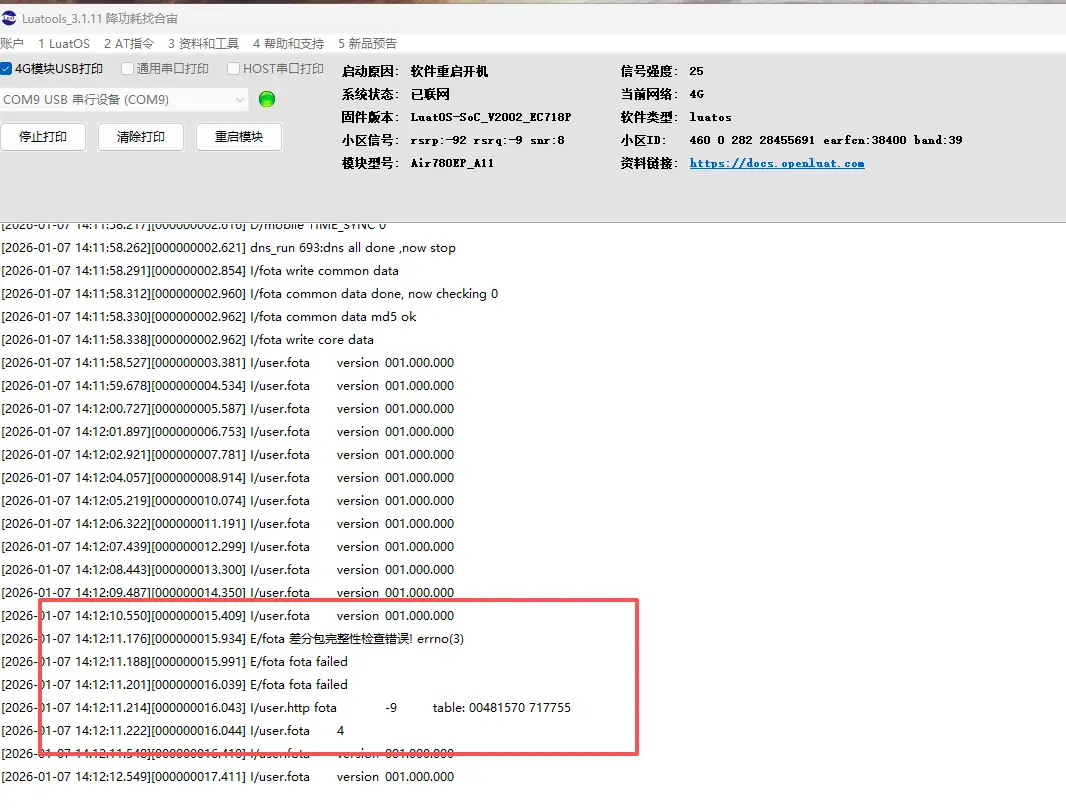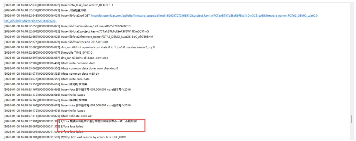 升级完成后,模块内部脚本版本号变成了 001.000.000 core 版本号为 V2004 ,下次模块请求升级的时候,当前固件上报的脚本版本号(001.000.000)依旧小于云平台存储的脚本版本号(001.000.005),然后继续下发升级包,就这么循环升级,直到流量耗尽,建议可以做一个类似 iot 平台的禁止升级规则