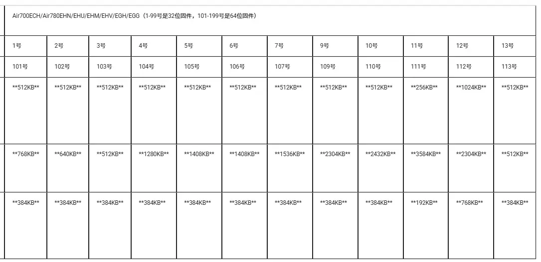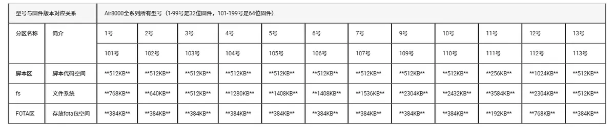 在实际使用中,不同的固件版本或型号为了支持不同的功能,会调整 FOTA 分区内的大小,因此用户实际可用的升级空间可查看下表。