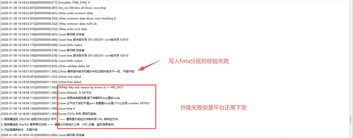 结论:使用错误编号的固件包升级时,其设计的分区地址与设备当前分区布局不匹配。FOTA 机制会在升级包写入前校验升级包,将会检查出完整性异常,并返回升级失败。