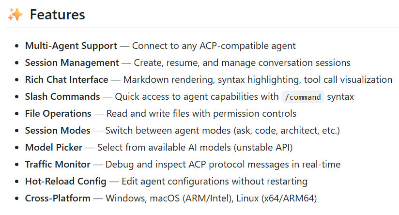 默认支持连接 GitHub Copilot, Claude Code, Gemini CLI 和 Qwen Code ,当然也可以另外配置任意的 ACP Agent 。