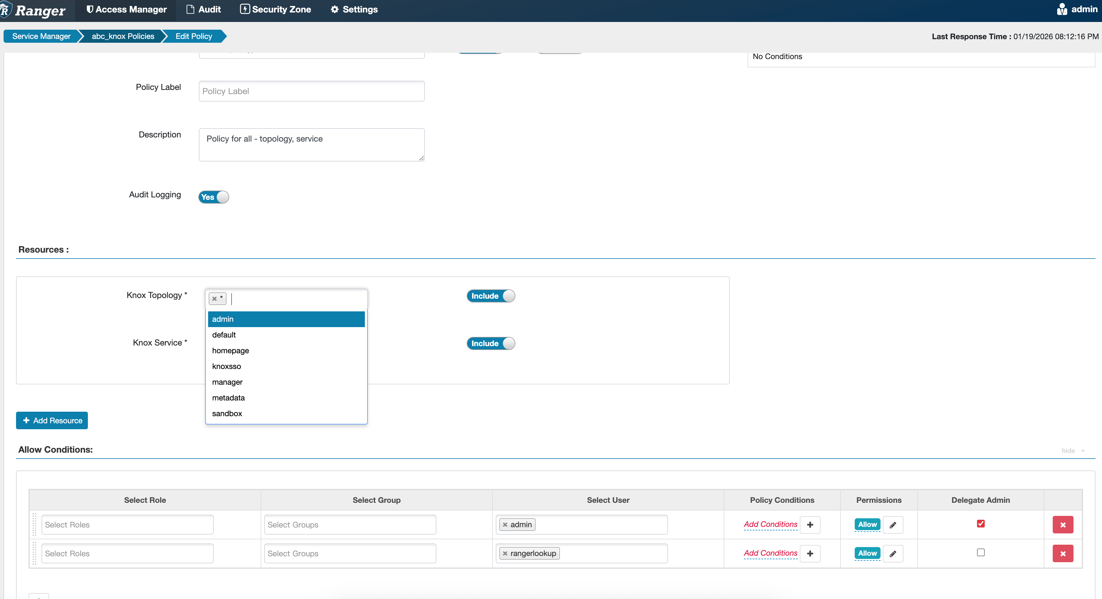 常见于 Ranger Admin → Service → Knox Service → Resource Lookup(例如选择 topology / service / path 时的下拉与联想查询),Ranger