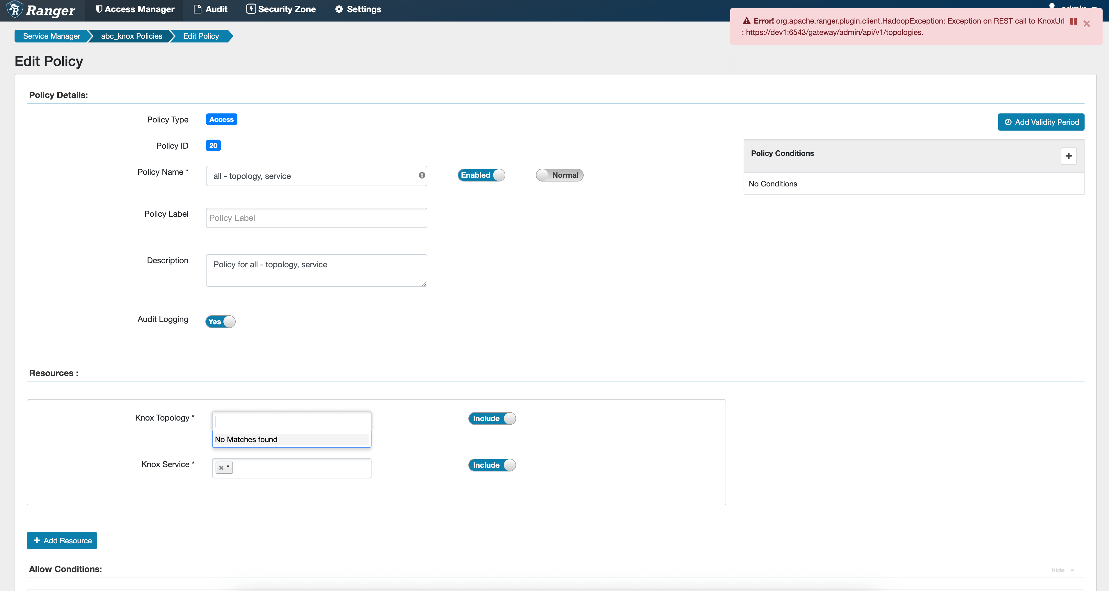 org.apache.ranger.plugin.client.HadoopException: org.apache.ranger.plugin.client.HadoopException: Exception on REST call to KnoxUrl : https://dev1:6543/gateway/admin/api/v1/topologies.