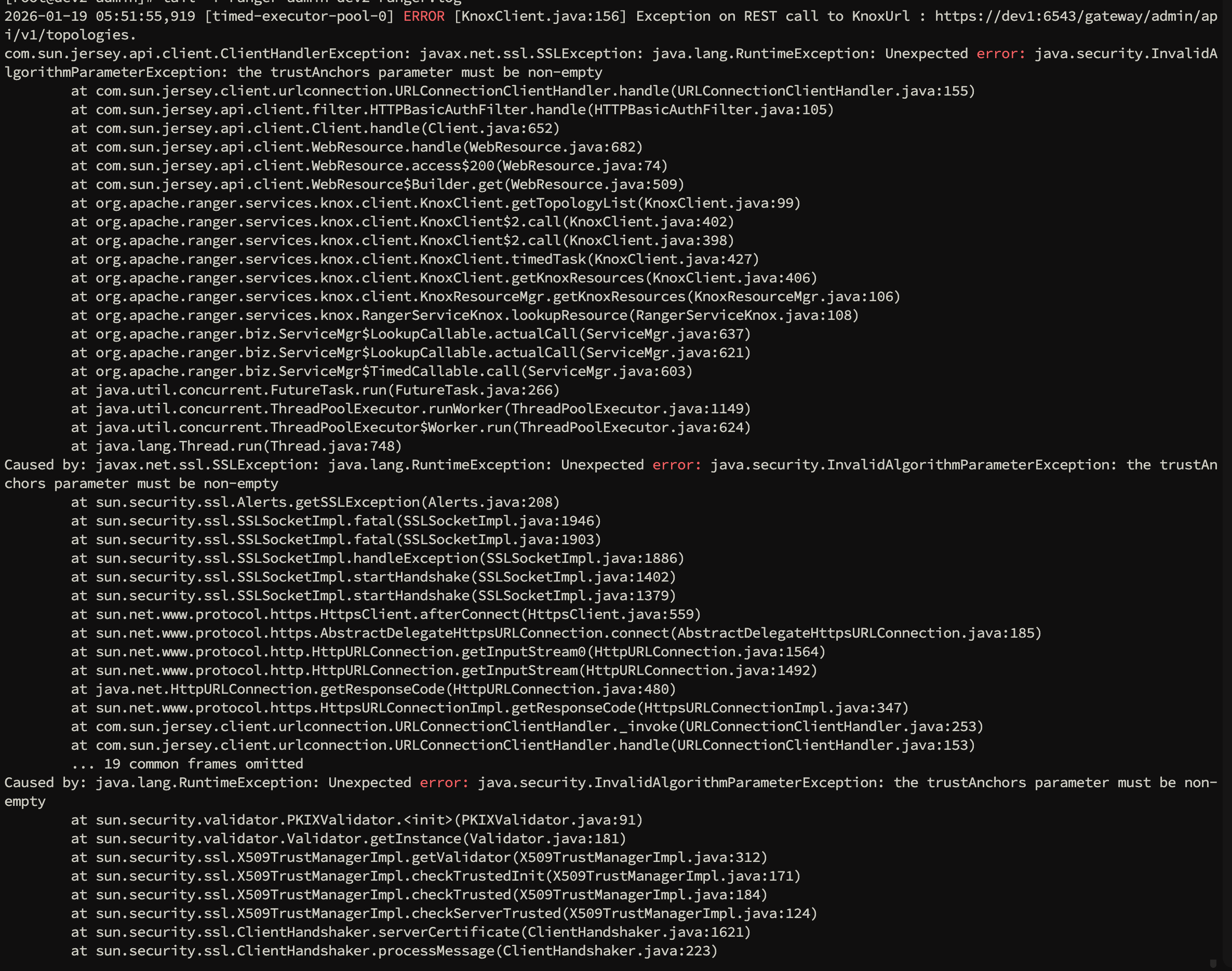 2026-01-19 05:51:55,920 [timed-executor-pool-0] ERROR [ServiceMgr.java:605] TimedCallable.call: Error:org.apache.ranger.plugin.client.HadoopException: Exception on REST call to KnoxUrl : https://dev1:6543/gateway/admin/api/v1/topologies.