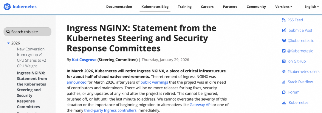 英文版公告:https://kubernetes.io/blog/2026/01/29/ingress-nginx-statement/